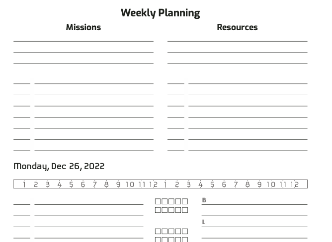 - Flexible daily pages with ways to track time, meals, moods/habits, progress, wordcount, etc.